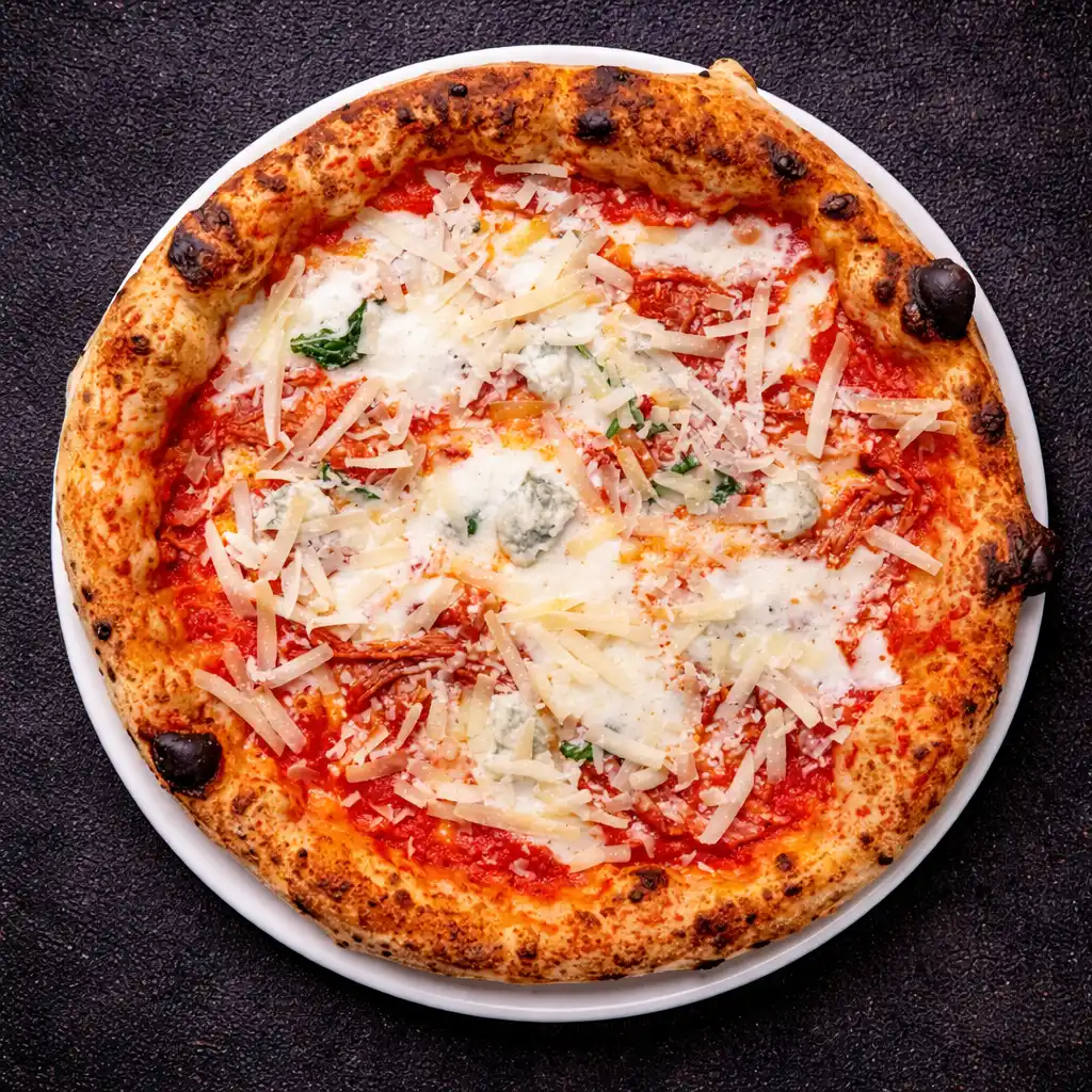 tomato sauce, mozzarella cheese, spicy salami, gorgonzola, parmesan slices