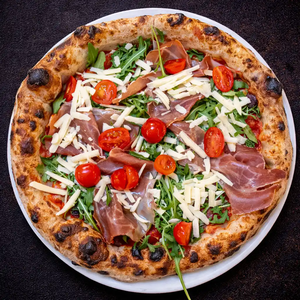 tomato sauce, mozzarella cheese and when out arugola, cherry tomatoes, Parma ham and Grana cheese chips