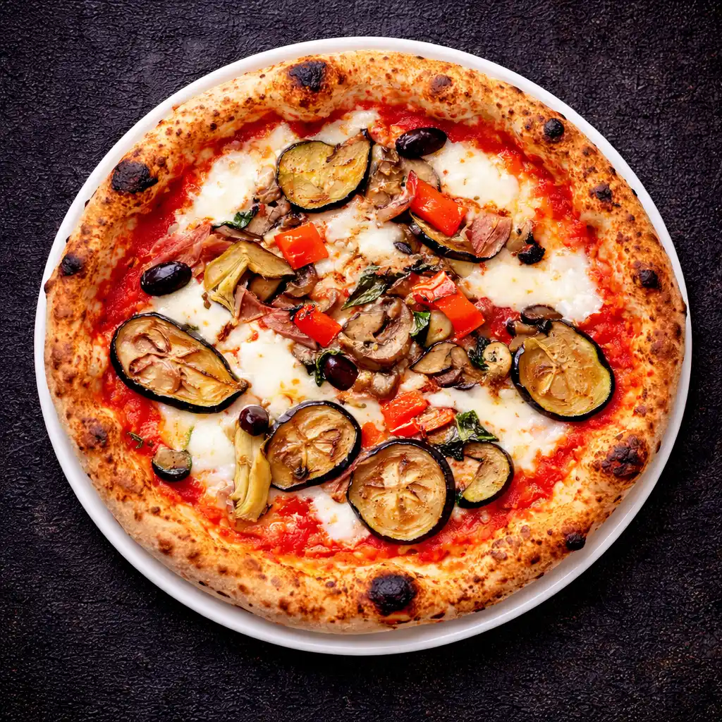 tomato sauce, mozzarella cheese, aubergines, zucchinis, bell peppers, e.v. olive oil, basil